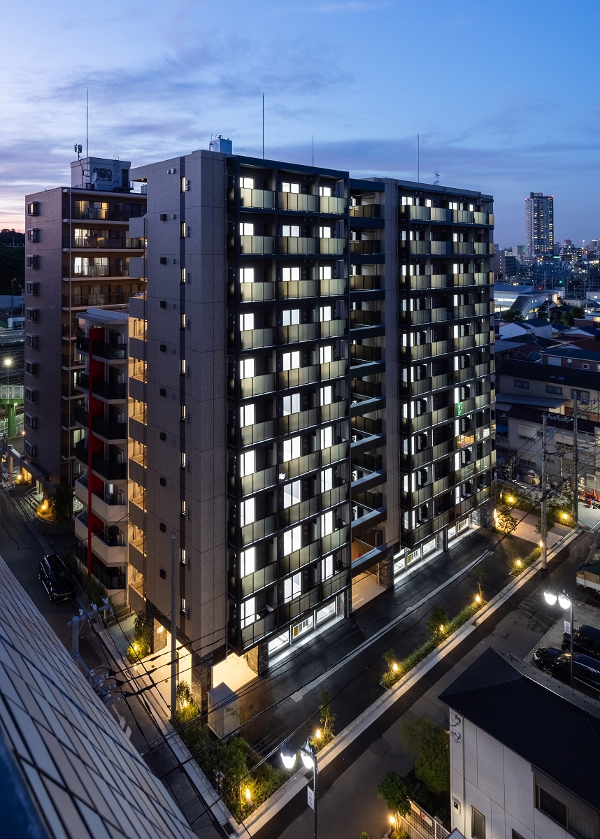 ラグゼナ横浜鶴見Ⅱ (賃貸マンション) ~2024年 事業主 :株式会社タカラレーベン 設計・監理:權現領建築研究所 神奈川県横浜市鶴見区生麦5丁目 敷地面積:約606㎡ 建築面積:約273㎡ 延べ面積:約2,977㎡ 鉄筋コンクリート造(ラーメン) 地下1階/地上11階 1K:90戸(BR付あり)